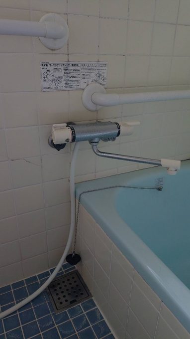 寿命も過ぎているので、蛇口交換をご提案させて頂きました。今悪いところの部品交換だけでも高くなるので、丸ごと変えたほうが後々お金がかからないので、同じタイプのサーモスタット付浴室蛇口に交換致しました。