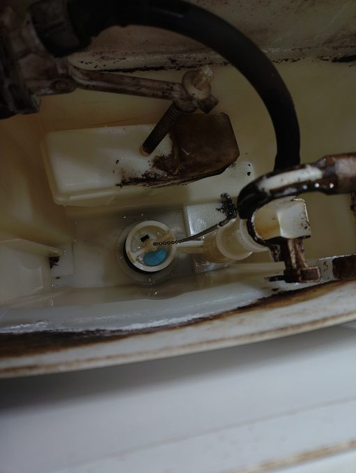 トイレタンク内に水が溜まらない状態でした。タンク内を点検すると、タンクの底にあるフタが劣化していました。そのため、タンク内の水が便器に流れている状態でした。