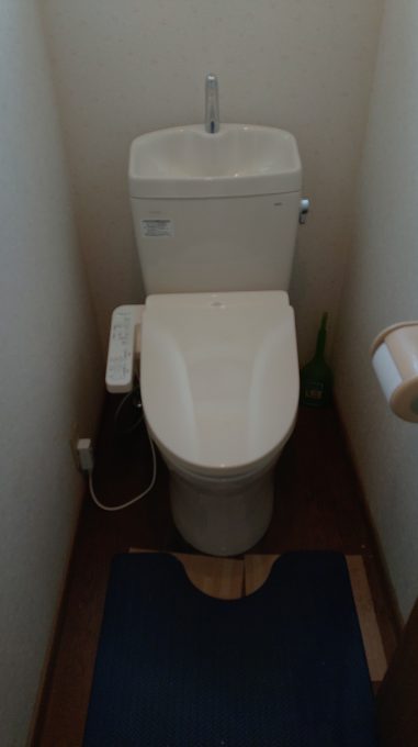 トイレを取り外します。新しい便器を取り付けたいのですが、タイル地の床なので、穿孔してプラグを入れ、ビス止を致します。排水管、給水管を接続。タンク、便器を取り付け設置完了です。