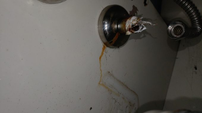 ご使用20年の洗面台の止水栓。劣化により止水栓が折れてしまってます。水があふれ、あたりはビショビショです。